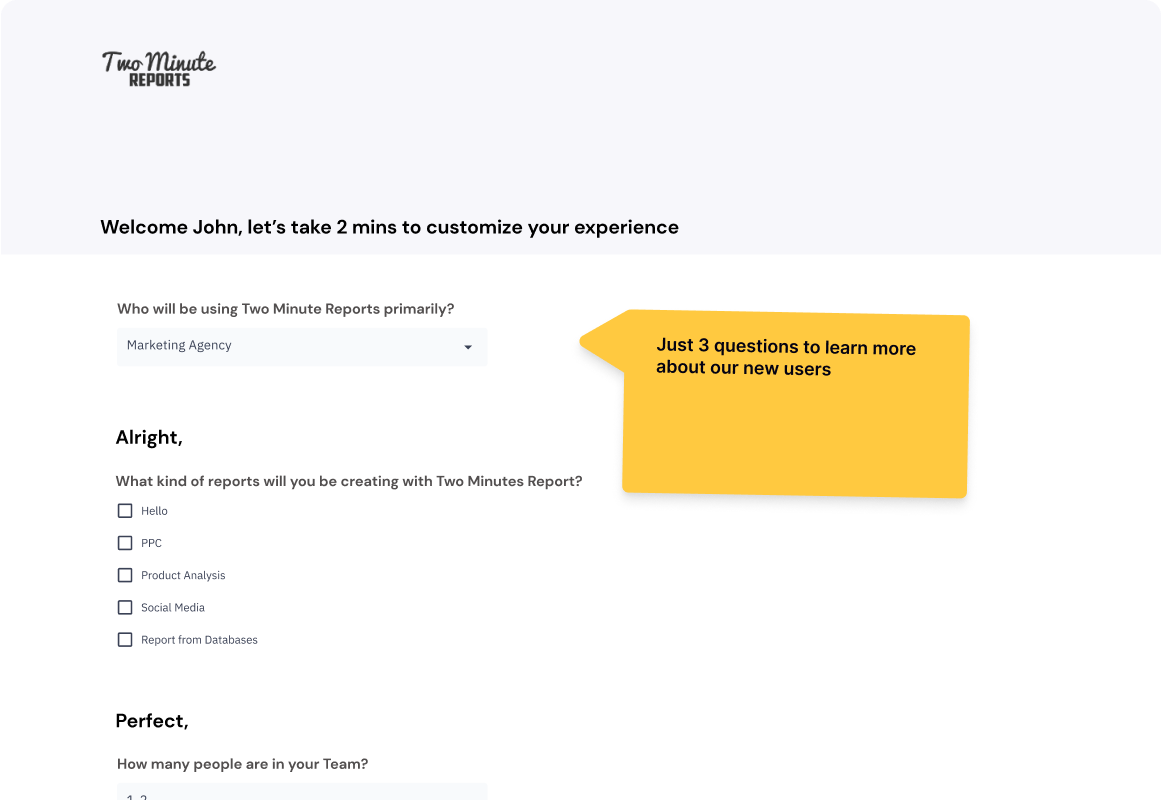 Contextual onboarding makes sure that we give users a personalized user onboarding experience which suits their needs perfectly. We designed onboarding UX flow for TwoMinutesReport (Product Hunt Top Product) in the same way